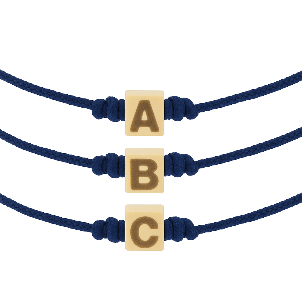 LUIS MORAIS 14k Yellow Gold Four-Sided Custom Cube Bracelet on an adjustable cord bracelet. Choose a custom combination of different letters, numbers or symbols.