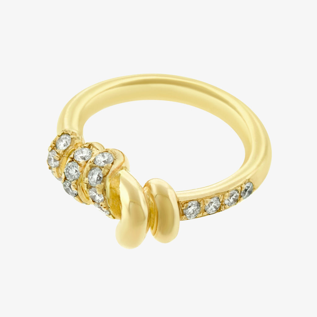 LUIS MORAIS 14k yellow gold thin Entangled Knot ring with white diamond accents. This ring features an entangled knot, symbolizing the interconnectedness of life, love, and destiny. The design represents how our paths, though complex, are ultimately bound together in a shared journey. A meaningful reminder of the strength found in togetherness the bonds that hold us together.